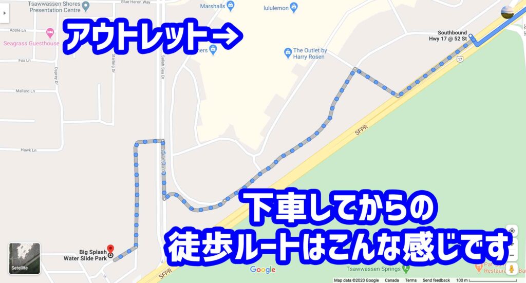 バンクーバーのダウンタウンから車で約40分、スカイトレイン(Skytrain:電車)とバスなら1時間20分ほど掛かります。