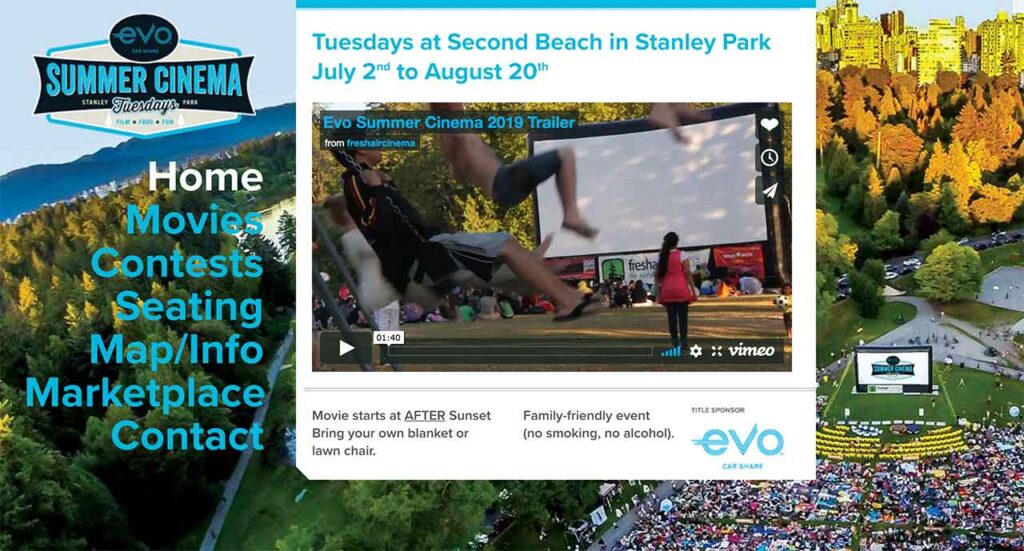 Stanley Parkで野外上映される映画とは、毎年夏にevo- CAR SHARE-という車のシェアを提供する会社がStanley Parkで映画を上映するイベント「SUMMER CINEMA STANLEY PARK」のスポンサーをしており、無料で映画を上映します。