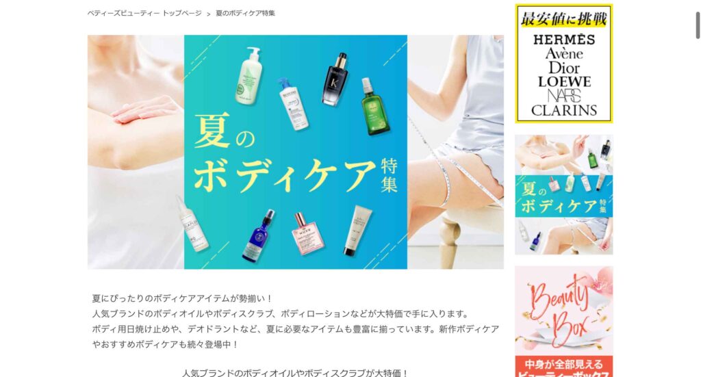 夏に必須な日焼け止めなどのボディケアアイテムやクリスマスや新年に向けた季節の期間限定キャンペーンなどをベティーズビューティーでは開催しています✨