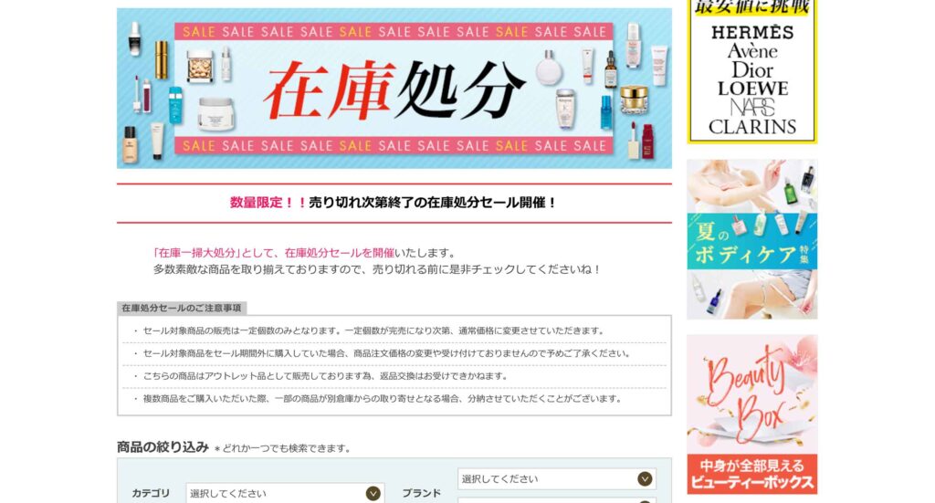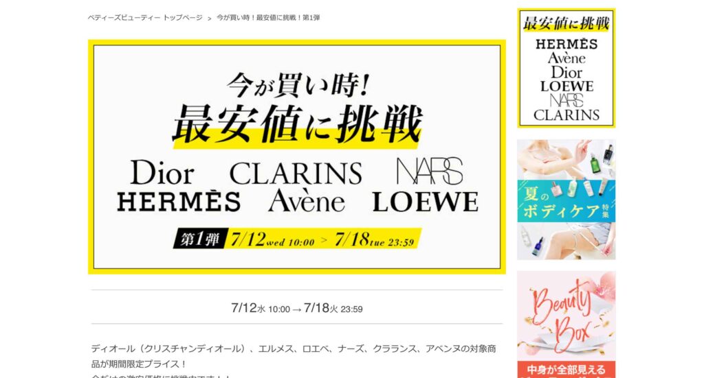 『数量限定のアウトレットセール』はベティーズビューティーが在庫整理で行うセールで「シャネル」や「ディオール」などの高級化粧品でも40%から60%ほど割引されます‼️