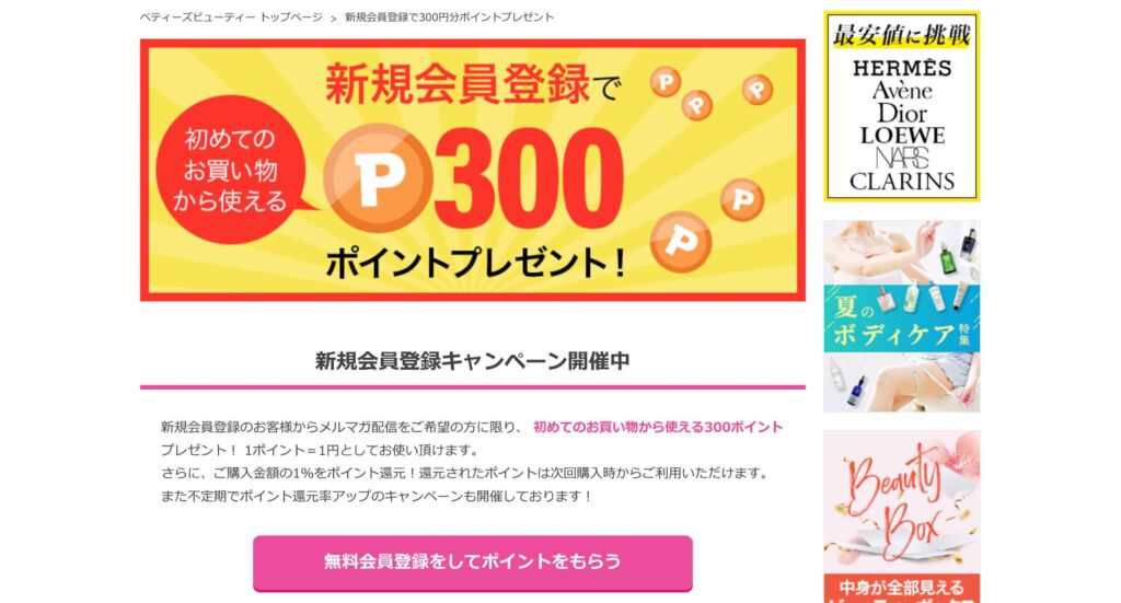 ベティーズビューティーで商品を購入するには会員登録が必須ですが、現在登録すると初回のお会計から使える割引ポイントが300円分もらえます‼️