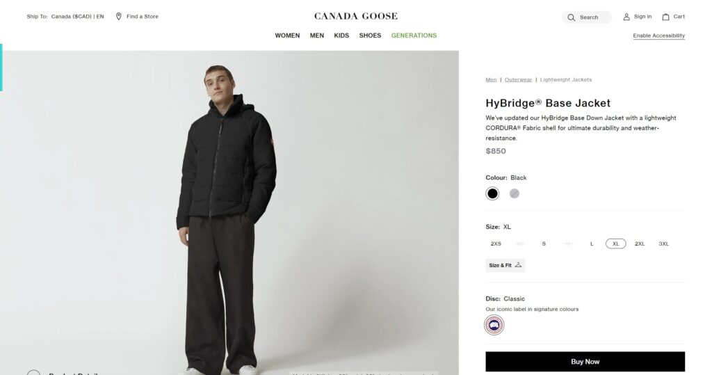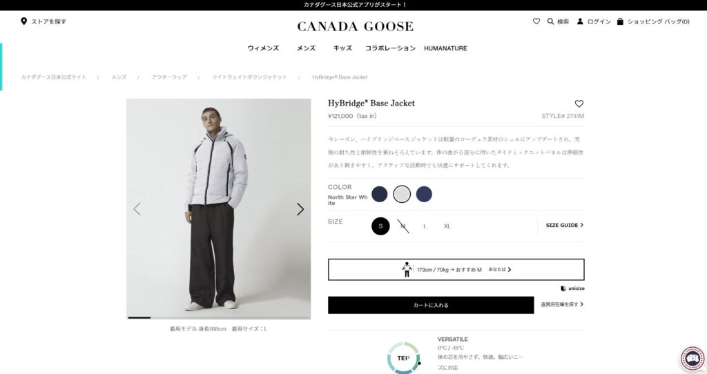 日本の東京にある CANADA GOOSE の直営店では HyBridge® Base Jacket が税込み121,000円で販売しています。