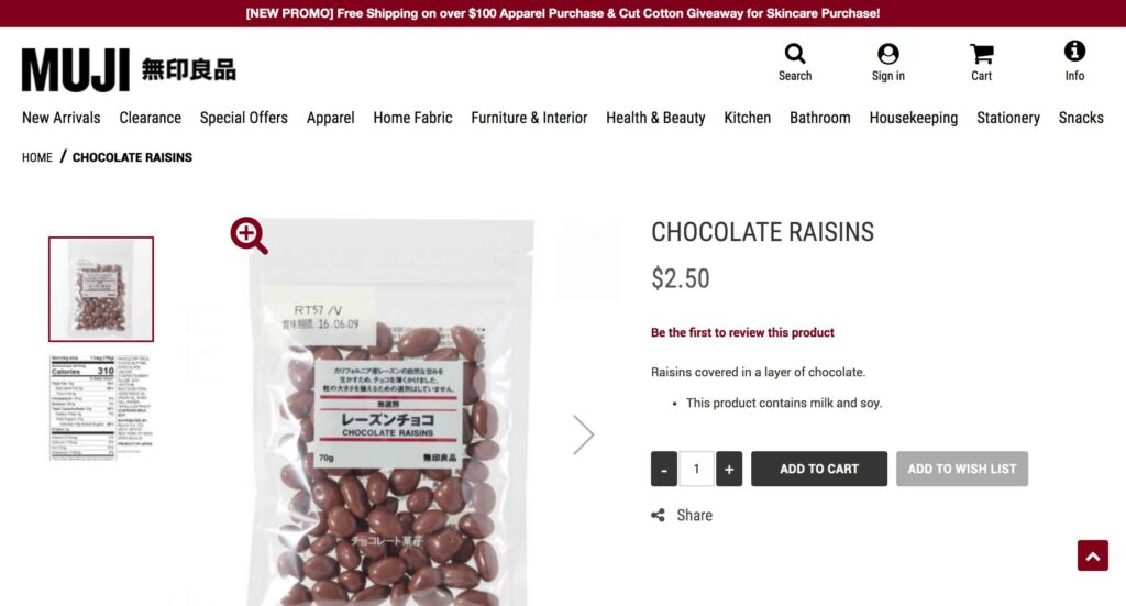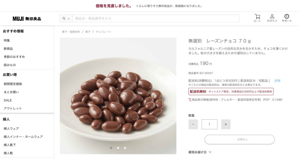 無印良品で販売をしているお菓子の「無選別 レーズンチョコ 70g」の定価は【190円】です。