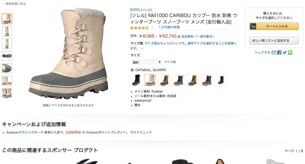 アマゾンで一番評価が高い商品は人気なハンドブーツではなく【[ソレル] NM1000 CARIBOU カリブー 防水 防寒 ウィンターブーツ スノーブーツ メンズ [並行輸入品]】でした👢