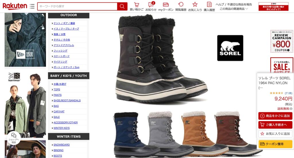「ソレルの公式ホームページ」で購入をした方が他の通販サイトと比較して種類も多く、公式から発送されるので安心感はありますが、個人的には「アマゾン」や「楽天」で購入をした方が各サイトで使えるポイントが付与されるのでオススメですね😌