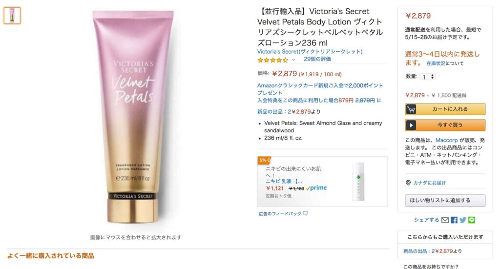 ちなみにヴィクトリアズ・シークレットの下着ではないですが、アマゾンで一番評価が高い商品は【ヴィクトリアズシークレットベルベットぺタルズローション(Victoria’s Secret Velvet Petals Body Lotion)】でした💄