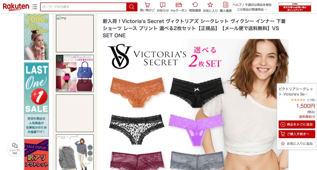 楽天で一番評価が高いヴィクトリアズ・シークレットの商品は「新入荷!Victoria’s Secret ヴィクトリアズ シークレット ヴィクシー インナー 下着 ショーツ レース プリント 選べる2枚セット【正規品】【メール便で送料無料】VS SET ONE」でした😌