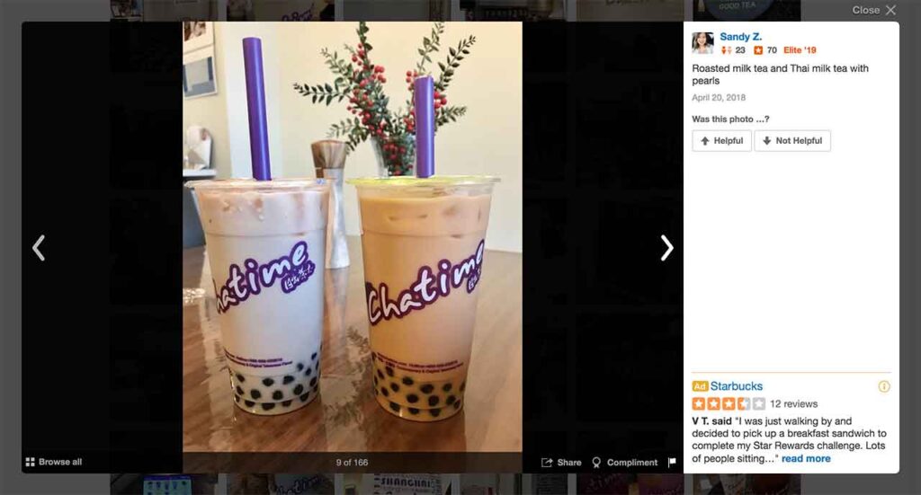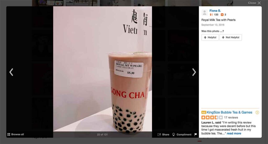 「紅茶」、「緑茶」、「ミルクティー」、「フルーツジュース」などの種類のバブルティーがあり、平均値段は$4から$5.50です💰