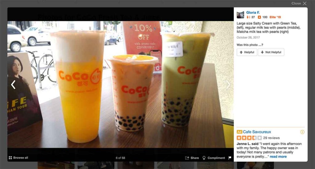 CoCo Fresh Tea & Juiceのバブルティーの平均値段は$3.90から$6.20で、サイズはミディアム、ラージがあります😌
