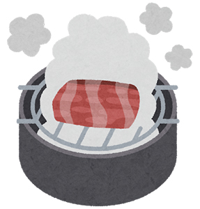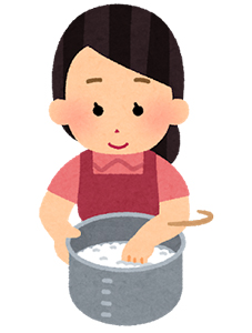 茹でる、煮る料理の例:ゆで卵、煮物、カレー、シチュー、肉じゃが、すき焼き、ジャム、パスタ、ラーメン、じゃがバター、そば、うどん