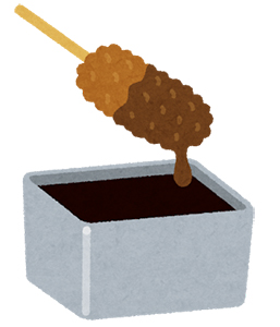 例文:coat a miso sauce with deep-fried skewers(串カツに味噌をつける)