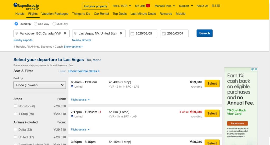 - カナダのバンクーバーからラスベガスの航空券の値段