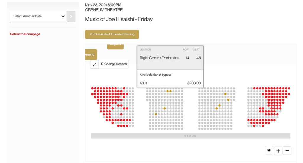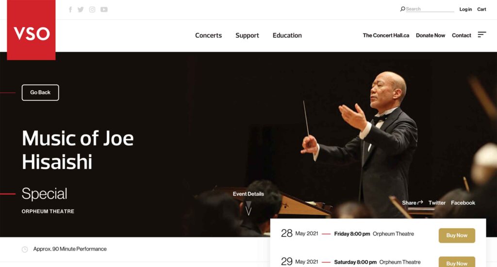 久石譲さんのコンサートは『Music of Joe Hisaishi – Vancouver Symphony Orchestra』からすることができます。