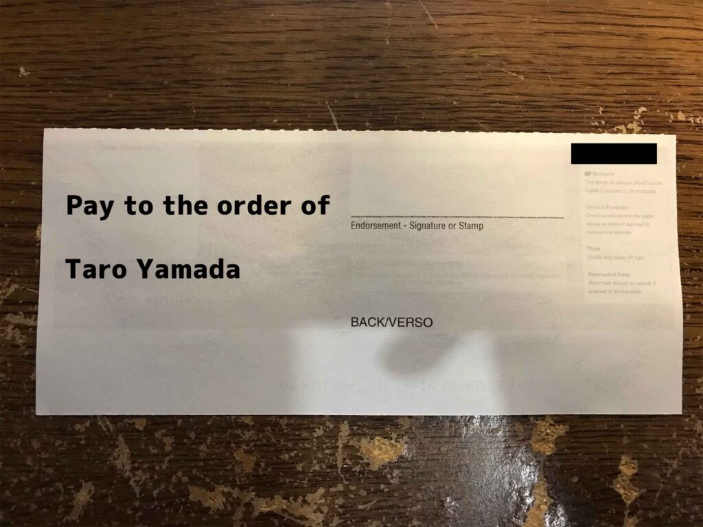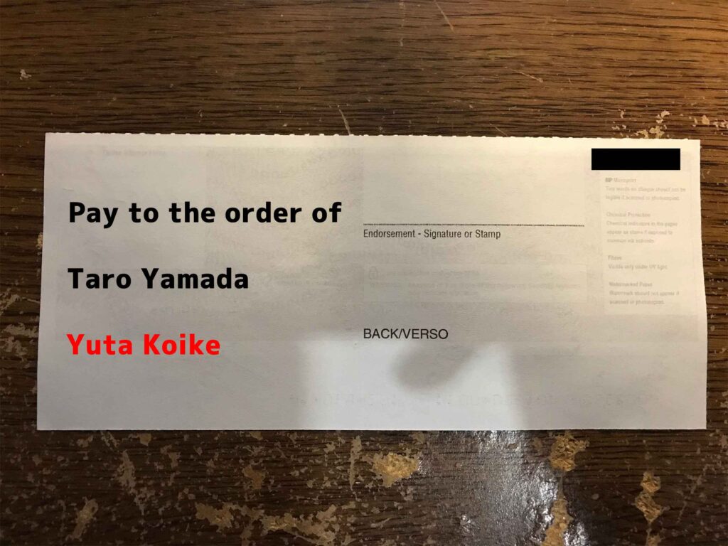 例えば、僕が山田太郎くんという友達に僕の小切手を受け取って欲しい場合は、「Pay to the order of Taro Yamada」と記載します。