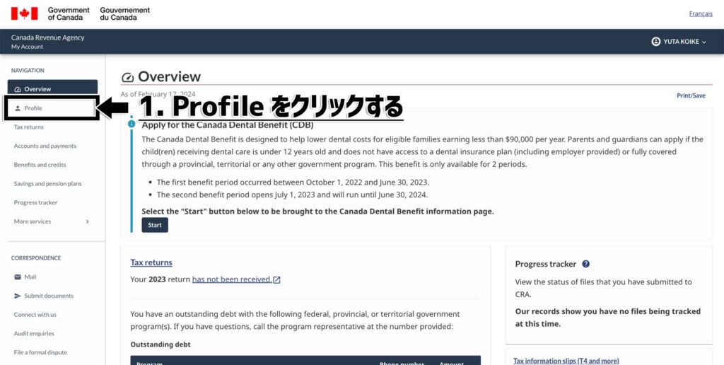 1.CRAのアカウントにログイン後、Profile をクリックする