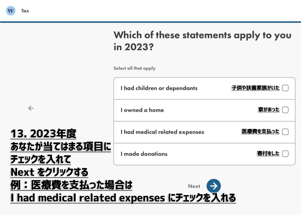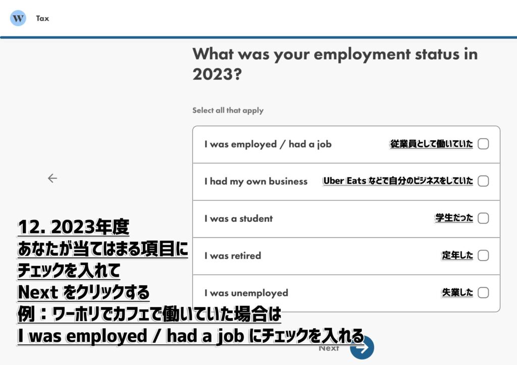 2023年度あなたが当てはまる項目にチェックを入れて Next をクリックする。複数当てはまる場合は複数の項目にチェックを入れる。