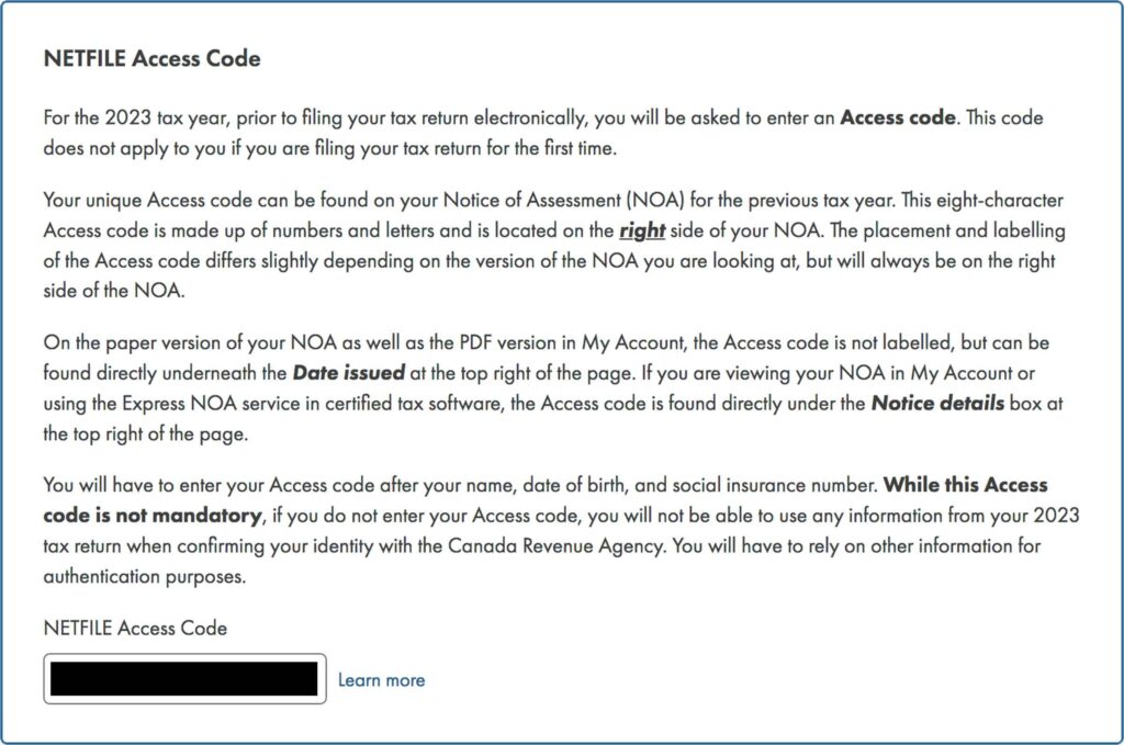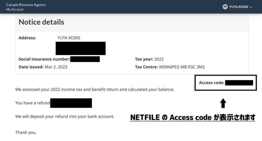 NETFILE Access Code は前年度のタックスリターンの Notice of Assessment(NOA)に記載されています。
