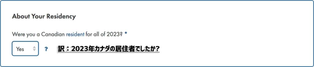 タックスリターン年(画像は2023年)の一年間カナダに居住していた方は「Yes」と回答しましょう。