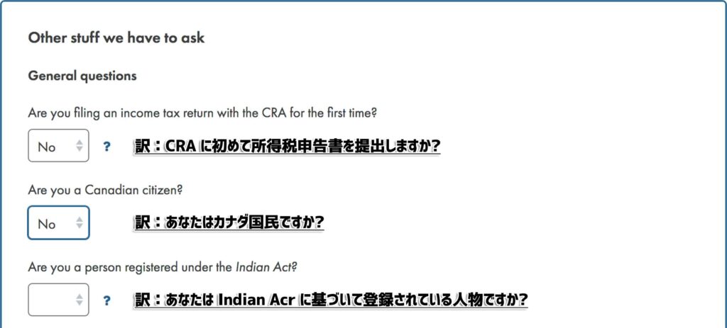 ワーキングホリデーや留学で初めてカナダに居住した方は、あなたの状況にもよりますが「Are you filing on income tax return with the CRA for the first time?」の質問は「Yes」と回答し、他の質問はすべて「No」と答えましょう。