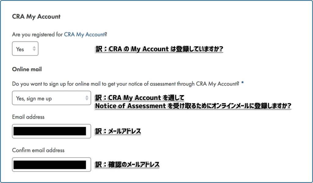 前編の記事で事前に CRA の My Account を作成された方は「Are you registerd for CRA My Account?」で「Yes」と選択し、メールアドレスを入力しましょう。