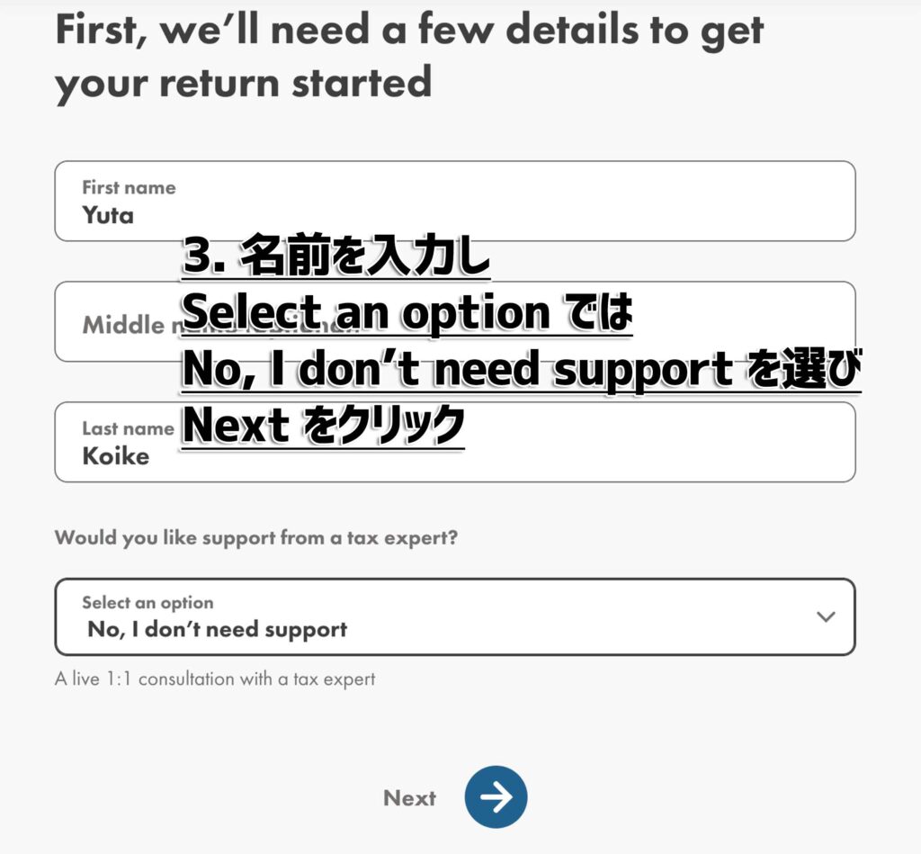 名前を入力し Select an option では No, I don’t need support を選び Next をクリックします。