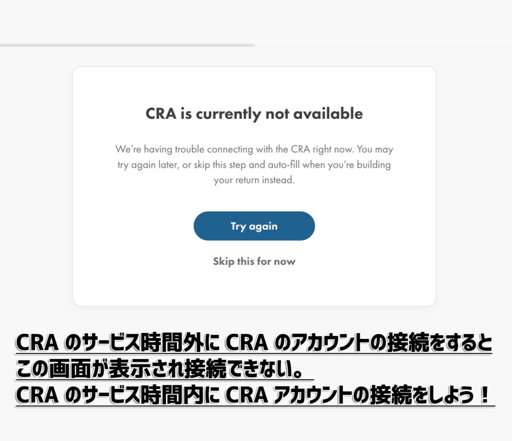 ちなみに CRA のサービス時間外にCRA のアカウントの接続をするとこの画面が表示され接続できず、下記の画面が表示されます。