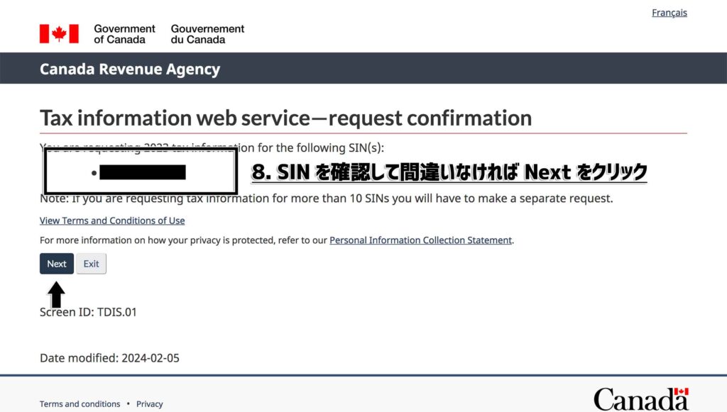 CRA へログイン後、SIN を確認して間違いなければ Next をクリックする。
