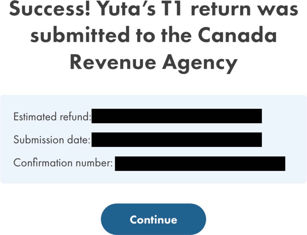 Success 画面にて、タックスリターンの返金金額(または支払い金額)、タックスリターンの日付、確認番号が表示されます。