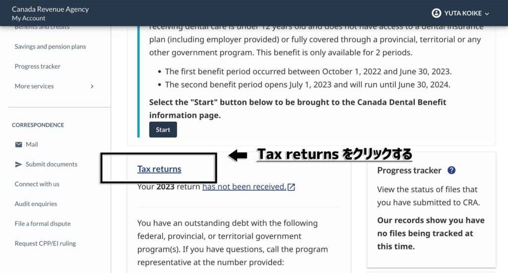 2022年など過去にも CRA のタックスリターンをしていた方は画像の質問は「Are you filing on income tax return with the CRA for the first time?」の質問は「No」と答えましょう。