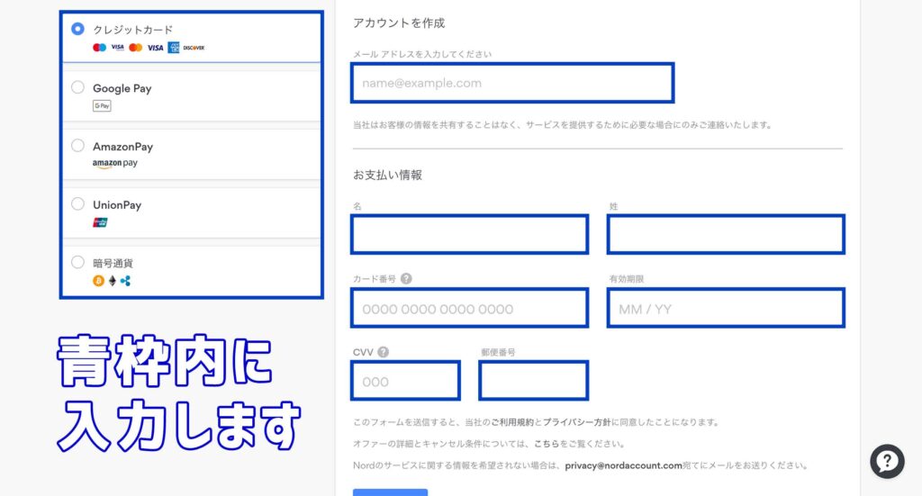 そしてアカウント作成のために必要なメールアドレスを入力して、最後にあなたが選択した支払い方法に必要な情報を入力して、【続ける】を選択します。