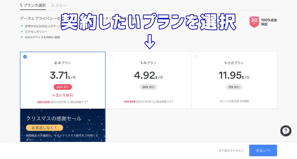 日本の会社の株式会社インターリンクが運営しているセカイVPNの場合は1ヶ月のみの料金体制しかありませんが、NordVPN は1年プランや2年プランもあり、長く利用すればするほど毎月の料金がかなり安くなりますね。