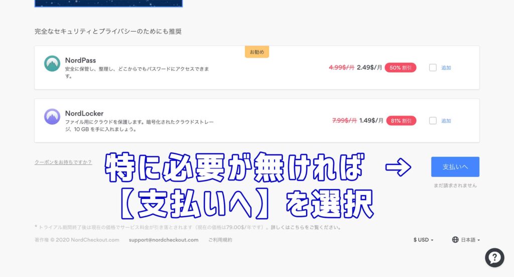 また NordVPN の他にも「NordPass」「NordLocker」などのサービスを追加で登録をすることができますが、 NordVPN のサービスとは全く関係がないので登録をしなくても大丈夫です。
