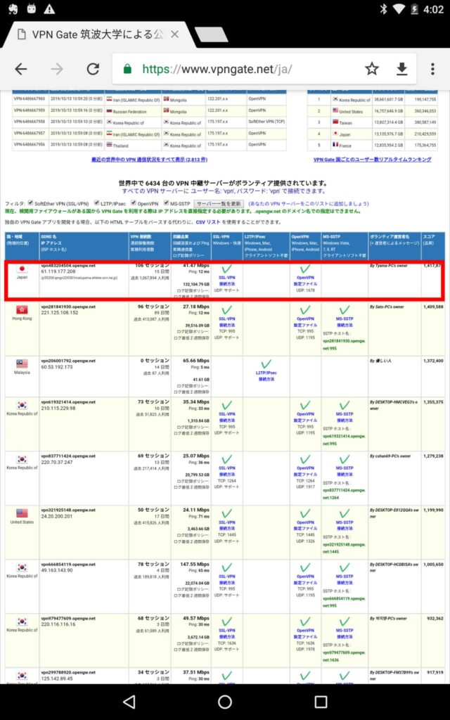 1.VPN Gate 筑波大学による公開 VPN 中継サーバープロジェクトの中から、「国・地域」が【Japan】のものを探し、「OpenVPN」に緑色のチェックが入っているものを探しましょう。