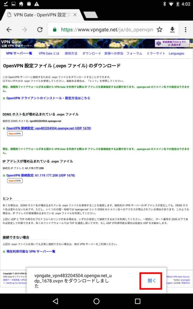 5.4を行うと下のポップアップウィンドウに「~.opvnをダウンロードしました」と表示されますので、【開く】を選択します。