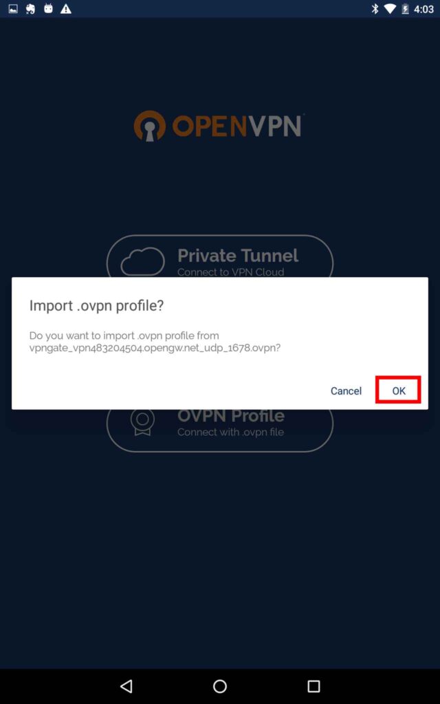 7.6を行うと「Import .ovpn profile?(.ovpnをインポートするのか?)」と尋ねられるので【OK】を選択します。