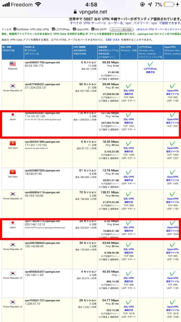1.VPN Gate 筑波大学による公開 VPN 中継サーバープロジェクトの中から、「国・地域」が【Japan】のものを探し、「OpenVPN」に緑色のチェックが入っているものを探しましょう。