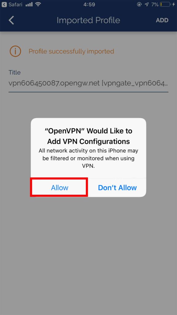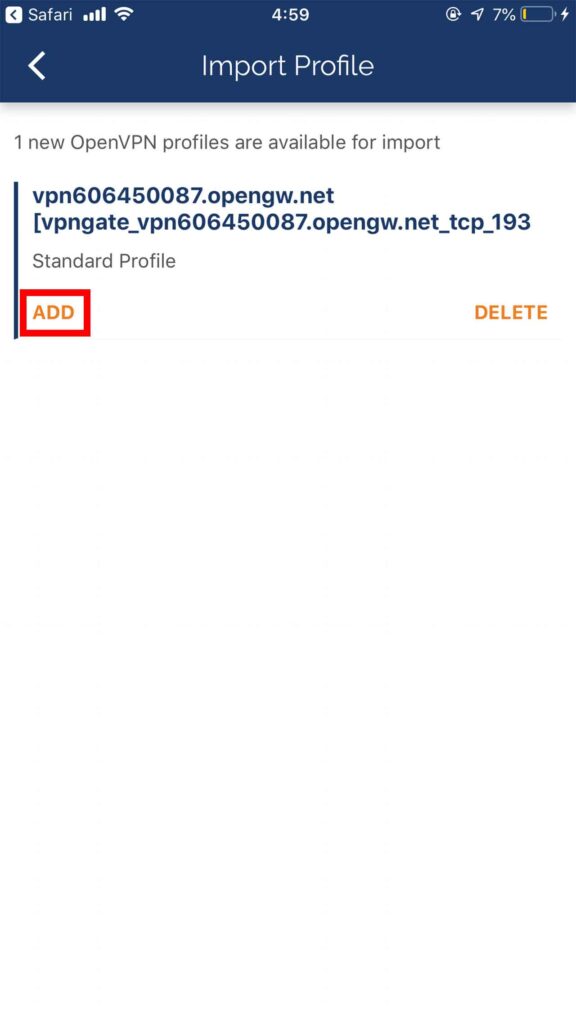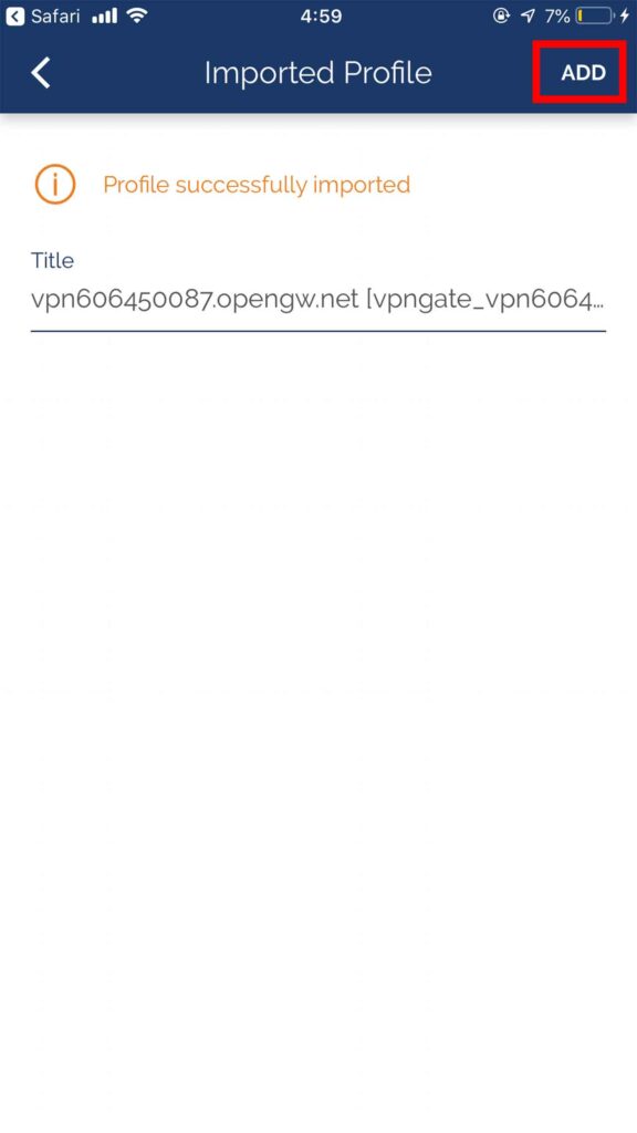 6.5を行うと「Profile successfully imported」とオレンジの文字で表示がされるので、【ADD】を選択します。