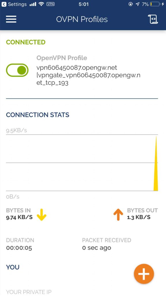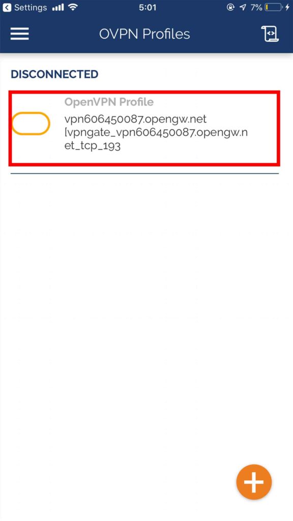8.「OVPN Profiles」に先ほど追加したVPNの設定情報が「DISCONNECTED」の下に表示されますので選択します。