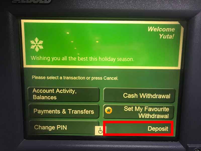 1.まずは小切手を持ってATMに行き、メイン画面を開いた後、「Deposit(預金)」を選択します。