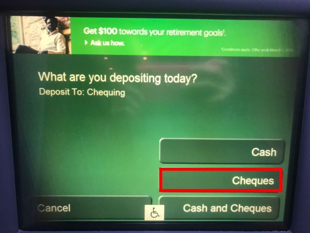 2.Deposit先を「Chequing」に選択した後、「Cheques(小切手)」を選択します。