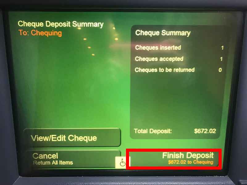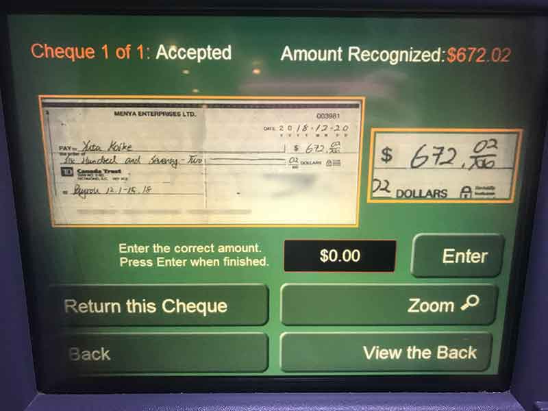 カナダのATMには小切手を読み込める機能が付属しているATMもありますので、銀行に行って順番を待つのが面倒くさい僕のような人はATMを利用しましょう!