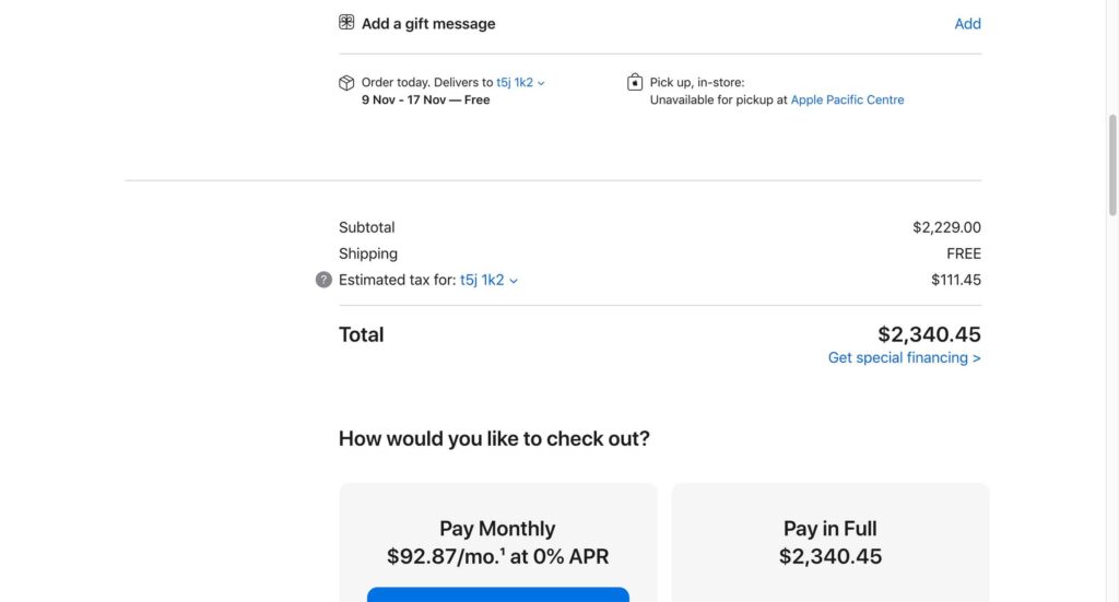 カナダの消費税が一番安い地域で同じくApple StoreでiPhone 13 Pro Maxの1TBモデルを購入すると$2,340.45(税込)です。