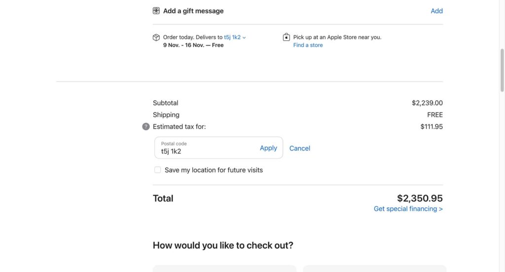 カナダの消費税が一番安い地域で同じく Apple Store で iPhone14 Pro Max の1TBモデルを購入すると$2,350.95(税込)です。