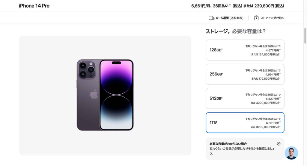 日本で iPhone14 Pro Max の1TBモデルを購入すると239,800円(税込)です。