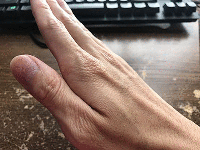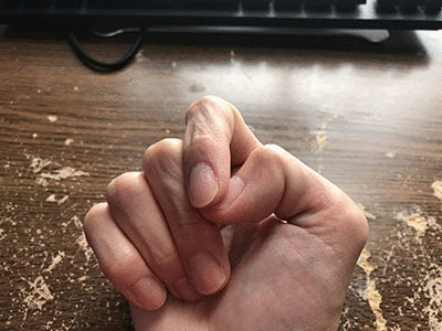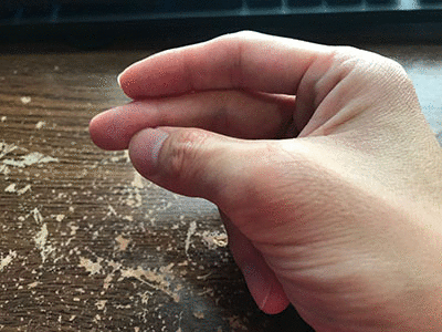 これは小さな子供と遊ぶときにするジェスチャーで、手を軽く握った状態で人差し指と中指で子供の鼻を軽くつまみ、人差し指と中指の間に親指を挟むといったものです。