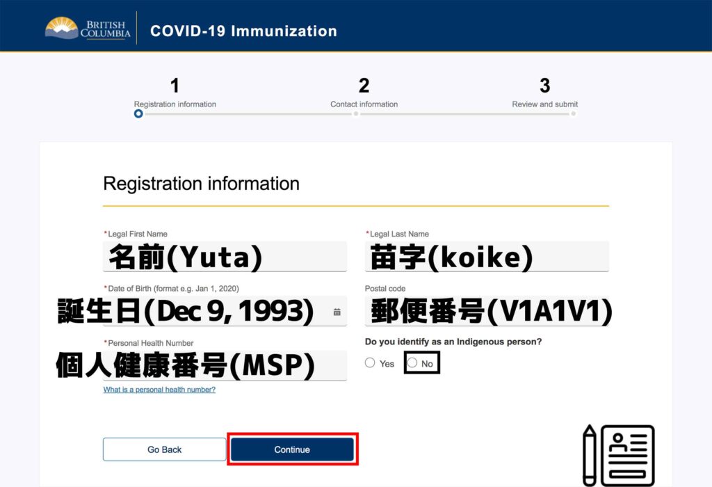 4 上記で紹介をした必要な情報を入力して、「Do you identify as an Indigenous person?(あなたは先住民として識別しますか?)」の質問は「No」を選択して、「Continue」を選択する