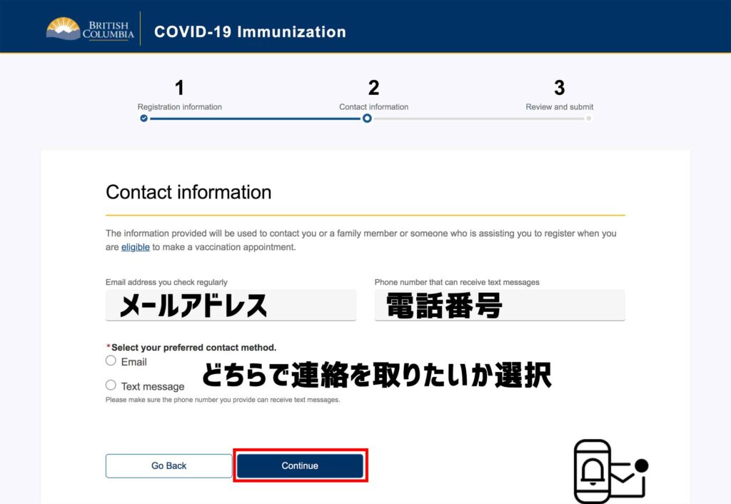5 BC州政府からの連絡を受け取方法(メールまたはテキストメッセージ)を選択する