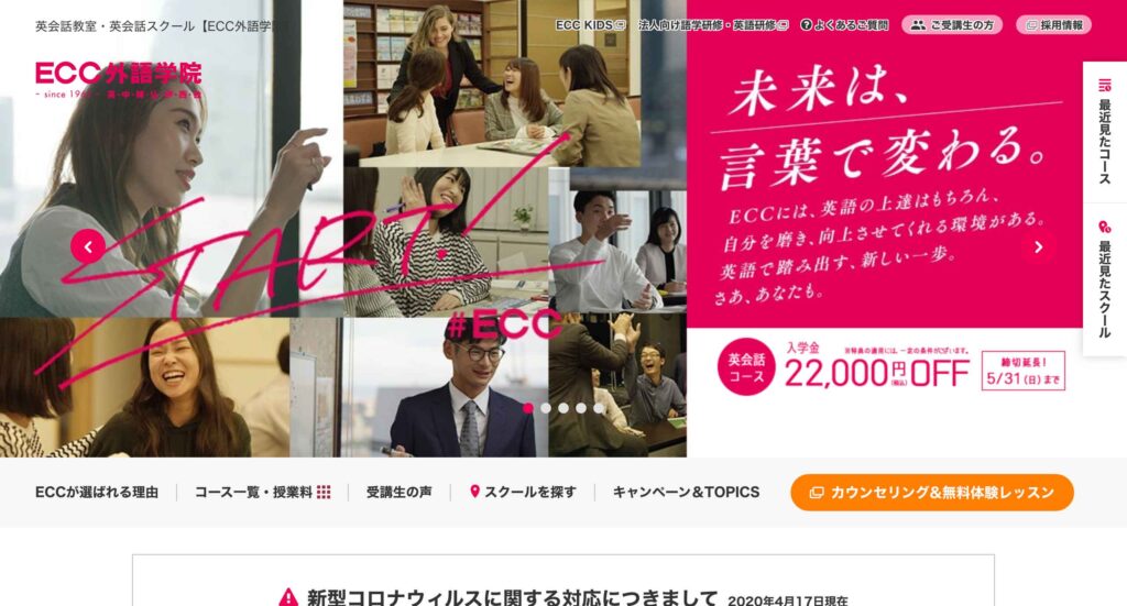 またオンライン英会話が苦手な人で教室に通う「英会話」に挑戦をしたいと考えている人は僕なら「ECC外語学院」を利用します😌