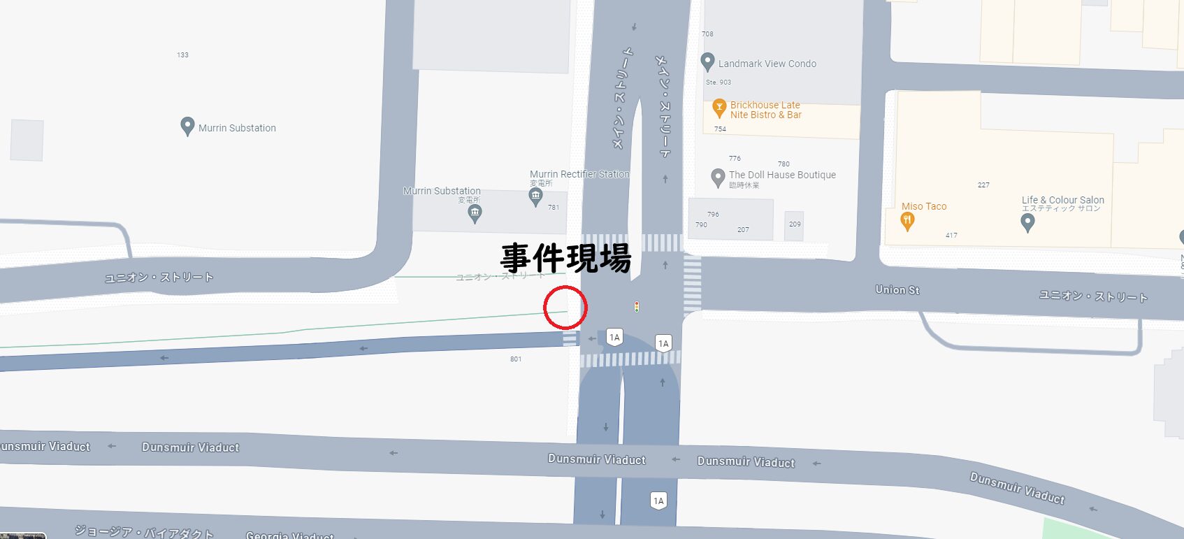 - 事件現場は Union St と Main St。現場の4ブロック先にある E Hastings St がバンクーバーで最も危険な通り