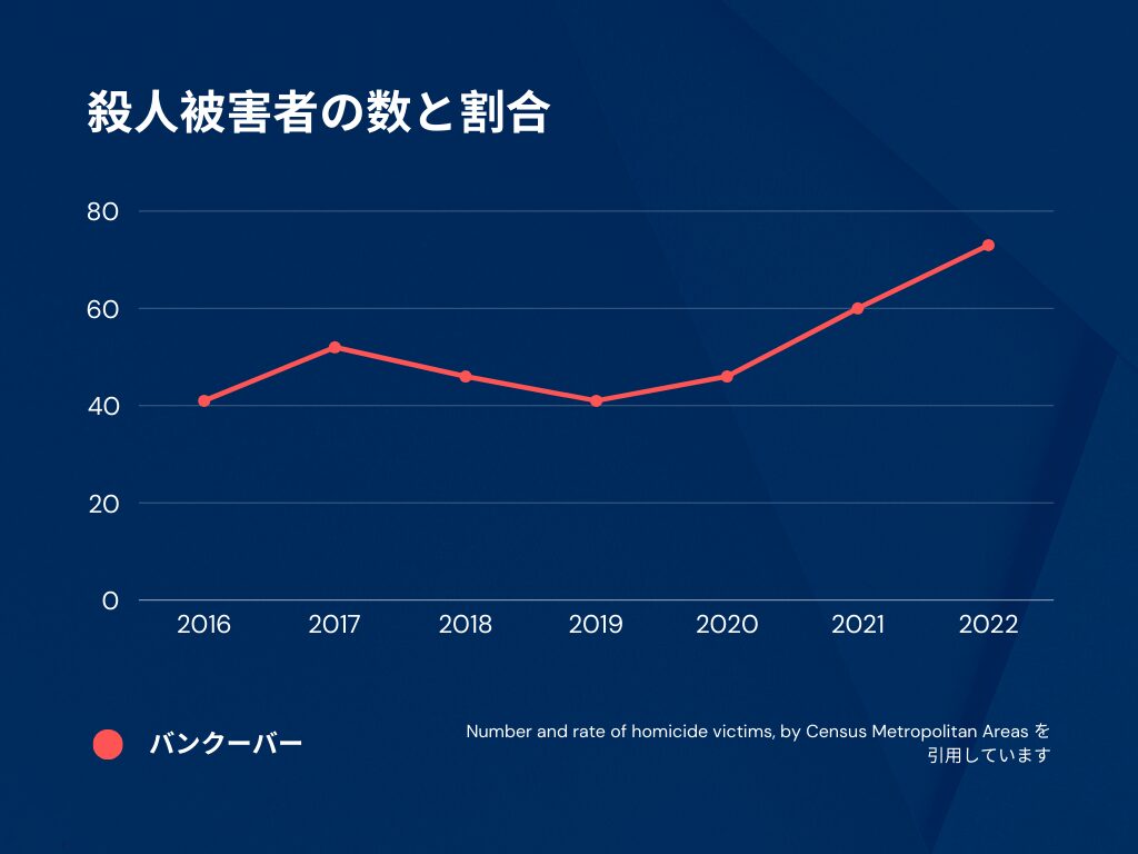 カナダ統計局でバンクーバーで起きた2016年から2022年までの殺人被害者の件数を調査したところ、2016年から被害者件数は増加傾向にあります。